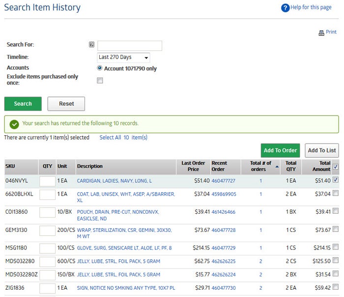 Searching your item history provides you with a comprehensive listing of items ordered within the selected critera. This is a great starting point for creating templates, re-ordering items, and reviewing your total item spend during a specified time period.