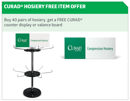 To better direct customers to your CURAD compression hosiery wall, bring in the CURCOMPVAL2 (2' wall space) or the CURCOMPVAL4 (4' wall space) headers.